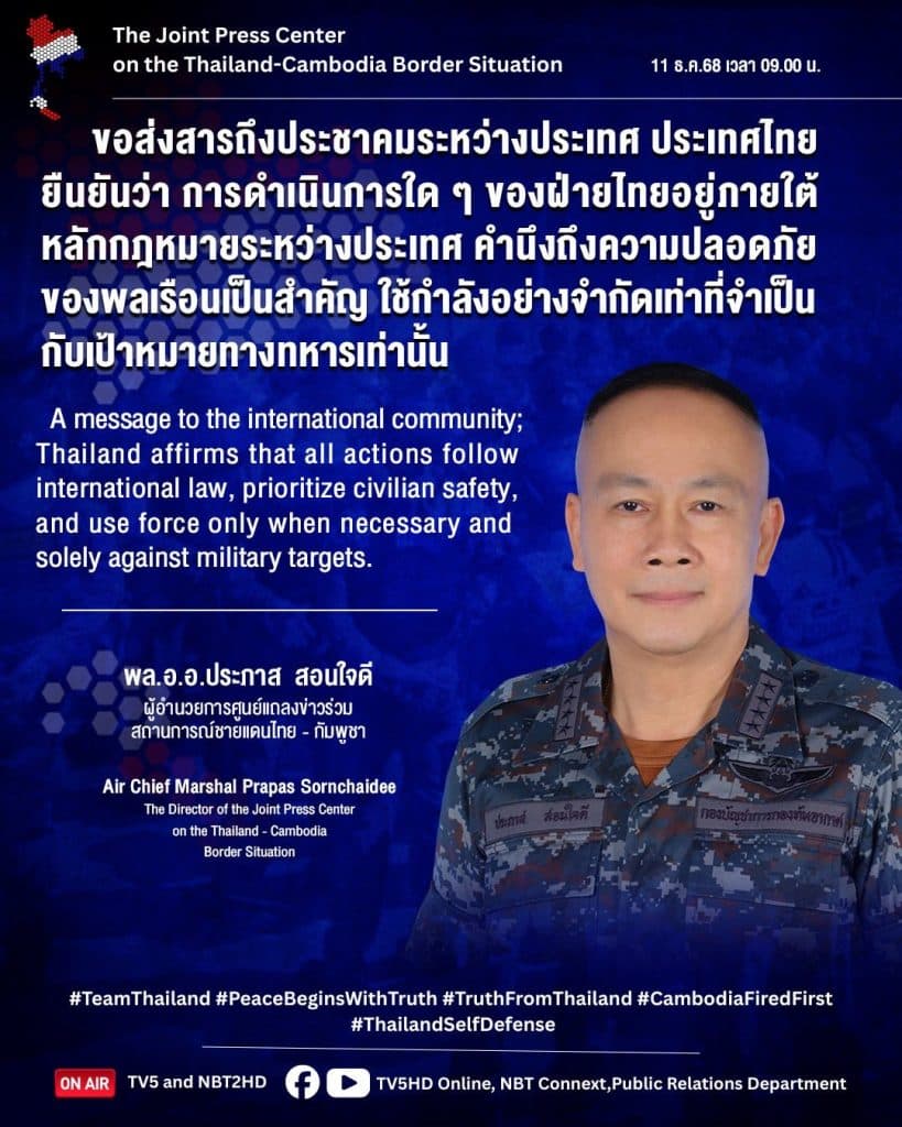 สารจากผู้อำนวยการศูนย์แถลงข่าวร่วมฯ ถึงพี่น้องชาวไทยและประชาคมโลก: เจ้าหน้าที่รัฐทุกคนกำลังปฏิบัติหน้าที่ด้วยความกล้าหาญและเสียสละ เพื่อความปลอดภัยของทุกคน และส่งมอบอนาคตที่สงบมั่นคงให้ลูกหลาน ไทยยืนยันการดำเนินการภายใต้หลักกฎหมายระหว่างประเทศ โดยคำนึงถึงความปลอดภัยของพลเรือนและใช้กำลังอย่างจำกัดเท่าที่จำเป็นกับเป้าหมายทางทหารเท่านั้น