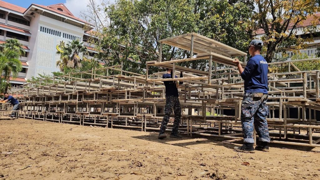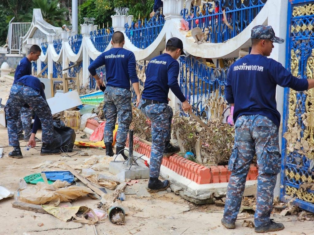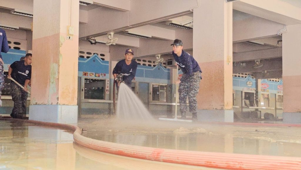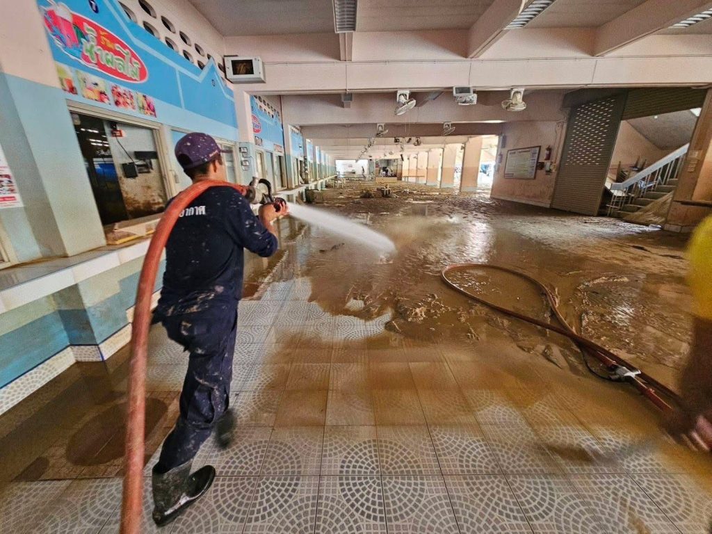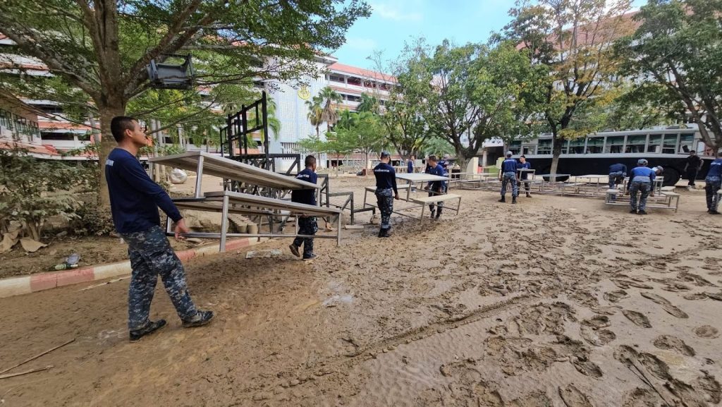 กำลังพล ทหารกองประจำการ พร้อมด้วยรถดับเพลิงและเครื่องมือที่จำเป็น ได้ร่วมกันปฏิบัติภารกิจทำความสะอาดครั้งใหญ่ เริ่มจากการฉีดล้างดินโคลนที่เกาะติดอาคารเรียน โต๊ะ เก้าอี้ และอุปกรณ์การเรียนการสอนอย่างพิถีพิถัน จากนั้นจึงร่วมกันขนย้ายสิ่งของที่เสียหายออกไป และจัดระเบียบสิ่งของที่สามารถใช้งานได้กลับเข้าสู่สภาพเดิม ทุกขั้นตอนดำเนินไปอย่างเร่งรัดและมีประสิทธิภาพ เพื่อเป้าหมายเดียวคือการ “เร่งคืนสภาพ” โรงเรียนให้กลับมาพร้อมต่อการใช้งาน และเปิดรับนักเรียนให้กลับมาสู่ห้องเรียนที่สะอาดและปลอดภัยอีกครั้ง