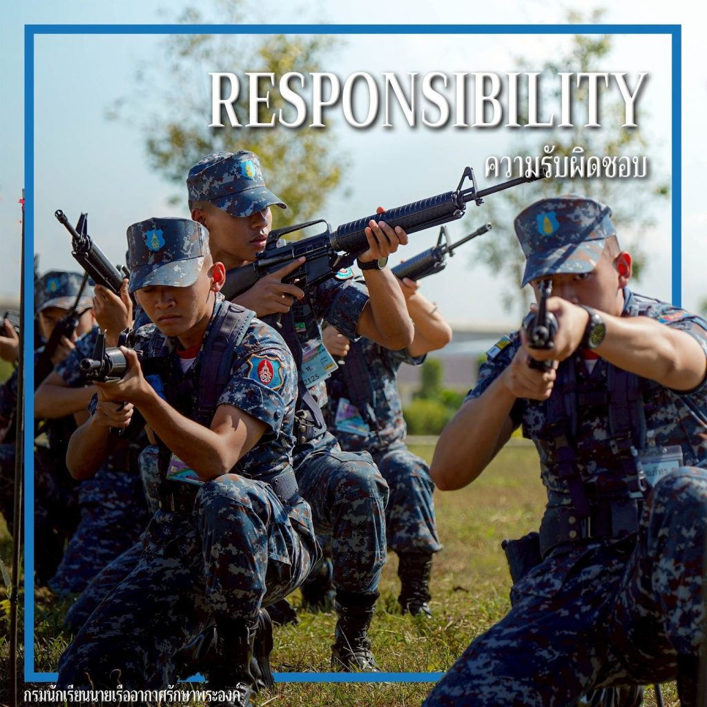 3. รับผิดชอบ (Responsibility): การตระหนักในหน้าที่และการยอมรับในผลของการกระทำ คือคุณสมบัติของผู้นำ นักเรียนนายเรืออากาศถูกสอนให้มีความรับผิดชอบต่อภารกิจที่ได้รับมอบหมาย ไม่ว่างานนั้นจะเล็กหรือใหญ่ และเหนือสิ่งอื่นใดคือการรับผิดชอบต่อความสงบสุขของประชาชนและการรักษาอธิปไตยของชาติเหนือผืนฟ้าไทย