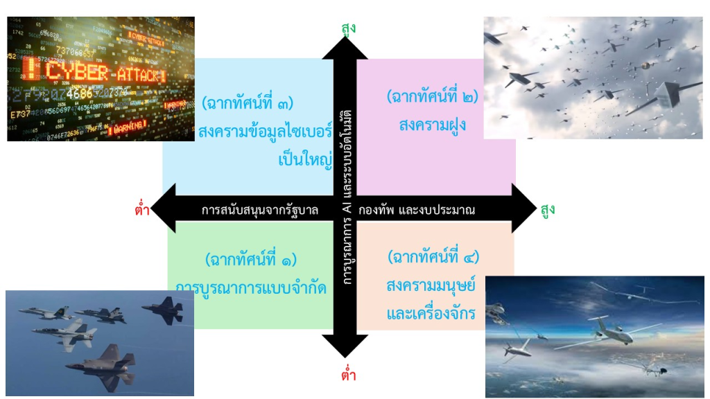- ฉากทัศน์ที่ ๔: สงครามมนุษย์-เครื่องจักร (Human-Machine War): แม้ได้รับการสนับสนุนสูงแต่เทคโนโลยีพัฒนาต่ำ ระบบ AI และโดรนถูกออกแบบมาให้ทำงานร่วมกับมนุษย์ได้อย่างราบรื่นและเป็นธรรมชาติที่สุด โดยมุ่งเน้นการทำงานร่วมกันระหว่างเครื่องจักรกับมนุษย์เพื่อชดเชยข้อจำกัดทางเทคโนโลยี